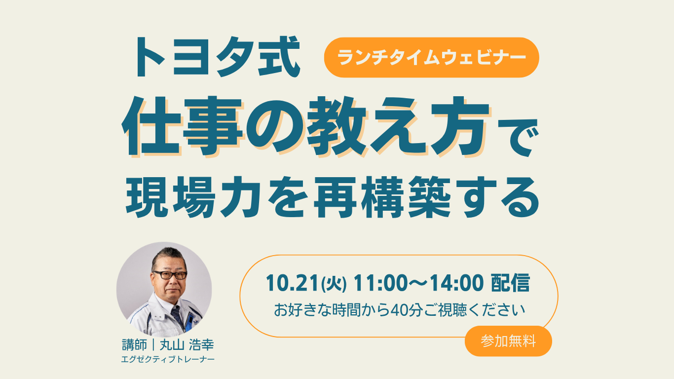 内容 | 「仕事の教え方」はトヨタの管理職の3大技能のひとつです。いかに優れた標準があっても、それを正しく指導して作業者の技能として発揮させなければ意味がありません。 本セミナーでは、トヨタの正しい「仕事の教え方」の4+4のステップを、実際にトヨタの現場で実践した弊社トレーナーが解説します。 トヨタ管理職3大技能のひとつ、TJIとは/教える前の4つの準備/4段階の教え方/講師のトヨタ体験談(40分) |