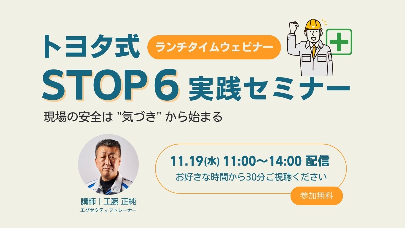 | 内容 | 安全対策、万全ですか? 製造現場で毎日起きている重大災害。その多くは「とっさの行動」で発生しています。 本セミナーでは、トヨタが現場で実践している安全対策「STOP6活動」をテーマに、重大災害につながる6つの危険源(動力・重量物・車両・高所・電気・高熱物)への具体的な対策を、トヨタで40年の現場経験を持つトレーナーがリアルな体験談とともに解説します。 「STOP6活動」の全体像と実践方法/現場の危険源を見つける視点と着眼点/現場で起きた“ヒヤリ”事例とその改善策(30分) |