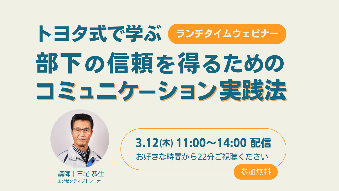 | 内容 | 部下との関係において、このようお悩みはありませんか? ・部下が指示待ちになり、主体性が育たない ・ほめ方・叱り方が難しく、関係性が不安定になりがち ・1on1をしても、本音や課題が出てこない ・若手の離職・定着に課題があり、職場の土台を整えたい 管理職の“コミュニケーションの詰まり”は、職場の空気と成果に直結します。本セミナーでは、トヨタが実践する「コミュニケーション教育」の視点から、部下の信頼を積み上げる具体的な関わり方を、すぐ現場で使える形で解説します。職場づくりを担う管理者の技能向上や、エンゲージメント向上のヒントとしてお役立てください。 |